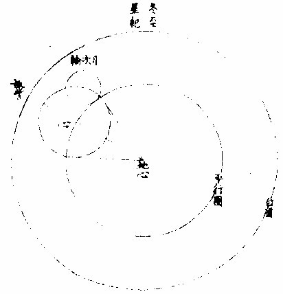 月自行轮周图 ![]() 月自行轮周图说 自行轮周为次轮心平行之轨道。〈即本轮〉次轮行于本轮周,左旋。〈与七政违行以本轮之最高为界〉初《逆行》。〈向左约九十度留际转初〉转顺行。〈向右至半周过最庳留际转中〉复逆行如图。月在次轮周。从地心作两线切。本轮周也。〈月在本轮上半周两切线外日逆下半周两切线内曰顺〉若月在心线。〈从地心过本轮心是为本轮之最庳〉两行。〈平行自行〉度分等,若在心线前,或后两度。〈视经度平行度〉必不等次轮,心从最高算日行。〈一十三度三分五十三秒五十六微〉为转度分,而一周为转终度分也。〈二十七日五十二刻一十一分五十四秒为次轮心从最高行一周而复于故处〉 月次轮图 ![]() 月次轮图说 次轮者,月体所行之轨道,其界向本轮心为最近,界之冲为最远。试以一线联两心线,即其界矣。〈如图甲丙乙丁线〉“月体在次轮近地心半周,即月体逆经度行而顺本轮行。若在其远地心半周,即月体顺经度行而逆本轮行。从本轮心出两线,切次轮两旁,即定本轮心第二均加减之界○。”如上《测月行诸论》,以定朔望,则用一自行之均数足矣,为朔望时,月体必在本轮内甲乙丙丁圈上故也。去离朔望,宜用两均数,自朔至望、望至朔,必行次轮一周而复。故月实行距太阳一百八十度,行次轮一周三百六十度,而次轮周之日行度,必倍于距太阳之日行度,每日得二十四度二十四分四十七,秒三十微。行一周为一十四日七十三刻七分有奇,半月之率也。〈天上周圈不论大小皆平分三百六十度〉凡月行距日九十度。〈两弦〉次圈周行半周,在次轮最远,而距平行经度为极远。如上图小轮上之月体所丽,为视行平行之极大差○。因上两小轮行度,在本轮有最高最卑,在次轮有最近最远,定为自行之四限。 月次轮高卑远近图 ![]() 《月次轮高卑远近图说》。 凡月在次轮上,最远。〈远近以去离本轮心论〉次轮心又在本轮之最高,则月距地心为极远,图为甲。月在次轮之最远,次轮心在本轮之最卑,则月距地心为极近,为乙。 若在次轮最近,本轮最高,则为次远,为丙;在次轮最近,本轮最卑,则为次近,为丁。因此四限屡变,视行之势也。惟朔望时,月恒在次轮之最近。 《论太阴晦朔伏见》 太阴晦朔伏见,古今立论,疏密迥殊。汉儒《洪范传》曰:“晦而月见西方,谓之朏。”〈亦曰朓〉“朏者,政缓所致;朔而月见东方,谓之侧匿。侧匿者,政急所致。夫晦在朔后,晦失也;朔在晦前,朔失也。历则失之,而归咎于政,诬甚矣。”唐历家以晦日之晨,月见东方,因立进朔之法,使月隐晦晨,明藏朔夕,此则钩索未能,而妄生迁变。使月有两朔,食乃在晦,将谁欺乎?《宋、元史》皆非之,颇为辨晰,然未能缕形其所以然也。夫月距晦朔,见有疾迟,因乎天度,因乎地度。即此方近处,合朔于亥子之交,而甲日之晨,乙日之夕,两见微明,亦时有之。此之进退,将安往焉?况海以南数千里,则有甲晨乙夕,终岁恒见者;漠以北数千里,则有朔在午中,朝暮皆见者。亦将使晨隐夕藏,其可得乎?今法若时若地,应速应迟,皆从筹算可密推;用仪器可指数。先事可豫言,临时可确按,又何庸转移避就为也。以此备述所繇,征之度数如下论: 问:“太阴合朔以后,恒以三日见于西方,亦有二日者。 其在晦以前亦如之,何故?”曰:“是其因有三○:一、因赤道上之黄道升降度,有正有斜。正升则斜降,斜升则正降。正升斜降者,秋半周六宫。”〈秋分左右各三宫〉是也。“斜升正降”者,春半周六宫。〈春分左右各三宫〉是也。〈皆论斜球非正平球〉“正升”者,赤道之升度多,黄道之升度少。“正降”者,赤道之降数多,黄道之降数少,斜升、斜降则反是。 “凡南极出地者”,与上《论》悉相反。 若太阴离正降六宫,则朔后疾见。若离斜降六宫,则朔后迟见。其在晦前亦如之。《离》正升六宫则迟隐,离斜升六宫则疾隐也。 月行黄道斜升正升图 ![]() 《月行黄道斜升正升图说》 如二图各有子午圈,有地平、有极出地等,有黄道宫。 次二图上图月离大梁为正降宫,次距太阳十五度,日入月在地平上为十三度半,即能见。下图月离大火为斜降宫,次距太阳十五度,日入月在地平上为十度,即不能见,一也。 月视行迟疾图 ![]() 月视行迟疾图说 一因白道南北如图设月距黄道五度,距太阳皆十五度,而纬分南北。 日月各有一日所行之轨道,即赤道距等圈也。今如图设黄道左右五度各一圈,交于距,等月在焉,两月各至地平,其弧有大小,则入地有先后,人见有迟速。 若在北,即入地后黄道疾见;若在南,即入地先黄道迟见。二也○。一因月视行度。若视行为迟段,则朔后见月迟;为疾段,则朔后见月疾。三也○。右第一,因月之见界,以十五度为限。其疾者,朔后一日又四分日之一而见也。若三因并合,又不待此。如合朔在亥子间,则甲日太阳未出,亦见东方;乙日太阳已入,亦见西方。何以征之?设月在黄道北五度,太阳躔实沈一十五度,本地北极高四十度,即昼长。〈甲之日也〉五十九刻。 〈日九十六刻〉加一日刻。〈甲之夜乙之日〉共一百五十五刻。〈甲晨至乙夕〉于时月行约得二十三度平分之。〈合朔前后〉得一十一度半,以加实沈十五度。〈日躔也〉得实沈二十六度半,是乙日日入时月之距日经度也。以减十五度,得实沈三度半,是甲日日未出月之距日经度也。日躔实沈十五度,其斜升五十三度一十三分。月离实沈三度半,又北距五度,其斜