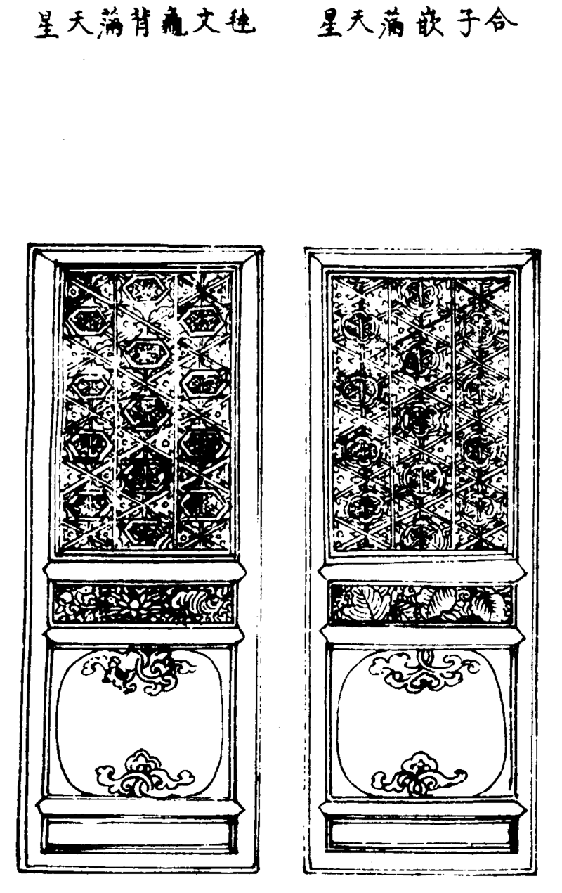 永樂大典卷之三千五百十八 九眞 〈慎說文門聞也。从二立之門。上圜下〉 〈。注朝門〉 〈智果〉〈徐嶠之〉〈顔眞卿〉〈黄庭堅〉 〈米芾〉〈趙子昂〉〈草書〉〈章草〉 〈皇象〉〈智永〉〈懷素〉 〈蘇軾〉〈米芾〉 〈張錦溪〉虋〈鮮于樞〉〈趙子昂〉 總叙〈事物紀原易繫。神農氏没。黄帝堯舜氏作。重門撃柝以待暴容蓋取諸豫。皇圖要紀曰。軒轅造門户然則門户之制。其在上棟〉 〈下宇之後乎。陳祥道禮書爾雅。柣于結謂之閾。棖謂之楔。樞謂之椳。樞達北方謂之落時。門持樞者。或達北檼以爲圖。落時謂之扈。樴謂之𢨪。在地〉 〈謂之臬。又曰。橛謂之闑。門棨。楣謂之梁。蓋界于門者楣也。亦曰柣。曰閾。中于門者聞也。亦曰闑曰橛。旁于門者楔也亦曰棖。所以開闔者樞也。亦曰〉 〈椳。樞上之横梁楣也樞達北棟落時也。月令曰。以修闔扇。爾雅曰。闔謂之扉。公羊曰。齒著于門闔。左氏曰。以枚數闔。越語曰。乃闔左闔。荀卿曰。子貢〉 〈觀於魯廟之北堂。復瞻九蓋。彼皆繼耶。蓋。即闔也。則扇也。闔也。扉也。其實一也。鄭氏釋月令。謂木曰闔。竹葦曰扇。蓋對而言之然也。禮。君入中門。〉 〈介拂闑。大夫中棖與闑之間。士介拂棖。賓入不中門。不履閾公事自閾西私事自閾東。蓋門以中爲貴。故君入中門。上介拂闑。大夫中棖與闑之聞〉 ![]() ![]() ![]() ![]() ![]() ![]() ![]() ![]() ![]() ![]() ![]() ![]() ![]() ![]() ![]() ![]() ![]() ![]() ![]() 〈格子門。前門之遺也。與李誡法式内版門軟門大同而小異。上多刻鏤牙口華版壼門。蓋神佛堂殿。富貴之家㕔館亦用之。秦晉亦云。隔截其格〉 〈子爲門。所以隔内外也。非實硬版所爲。故云軟門。用材 造格子門之制有數等混。或素通混壓邊綫。或心過雙綫四混壓邊綫。或混内出邊綫〉 〈壓邊綫。或心内素平兩下破瓣壓邊綫。或心内平三過綫兩下破瓣壓邊綫。各攛尖其門高六尺。至一丈二尺。每間分作四扇。如稍間狹促者。只分〉 〈作二扇或擔額梁袱下用者。或分作六扇。用雙腰串造程上下。門高一尺心串下空廣五分。如門高。串内用心桂小則不用。下是促脚串。并障水版〉 〈每扇各隨其長。除程及兩頭。内分作三分腰上留二分安格眼。腰下一分安障水版。或分作二分。合心一串。已下雙串。内腰華版厚六分至一寸。程〉 〈四角入池槽。下是障水版。其名件廣厚。皆取門程每尺之高。積而爲法。四斜毬文格子上。採出條徑重格眼各攛尖。其條徑加素毬文之厚。每毬〉 〈文圓徑二寸。更加毬文二分程及子桱亦如之。上混出雙綫。或單綫混内破瓣。或麓口絞准此加减。 四直方格子門。高一尺。條徑廣一分。厚八釐〉 〈或三空一實材。或兩空一實材。或通混不出綫壓邊綫。或起心綫。混内破瓣壓邊綫各四入尖爲之。小口絞。 兩絞萬字格子。長材夾短材。徑廣一〉 〈分一釐。厚八釐。或通混。或出心綫壓邊綫。混内破瓣壓邊綫并四入尖合角。卯口絞一寸。材空九分至八。 兩絞艾葉底上材聚四龜嵌合子。艾〉 〈葉條徑廣八釐。厚六釐。龜背條徑廣一分一釐。至二釐厚四釐隨空加减約度 三絞格子艾葉間毬文并雜花子心出雙綫平絞或素不嵌龜背〉 〈條徑加其廣之厚。如嵌單龜背雙龜背嵌六瓣芙蓉合子出尖瓣合子底上材造者。比艾葉條徑。减其廣之厚。龜背條徑。或通混壓邊綫。心出單綫〉 〈或雙綫内破瓣壓邊綫混小面在上。以空寸均匀可用爲定法 兩明格子門。其腰華障水版格眼皆用兩重程厚更加二分一釐子程及條徑之〉 〈厚各减二釐。額頰地袱厚各加二分四釐。其格眼兩重外而者安定。其内者。上開池槽深五分下深二分。 程門高一尺廣三分。厚二分四釐至六〉 〈釐。腦串。腰串促脚串厚皆同程。程。謂之門扇框。子程廣一分二釐至一分四釐。厚一分至一分二釐。斜割角内破心混。向裏壓邊綫廣取門程厚〉 〈之一半。 腰華版是雙串之内或就版上雕華入池槽。或襯版外别安華版。各隨四周之廣。華版上壓難子。 障水版。長廣各隨其程。四周入池槽〉 〈正面用牙口。或直難子後。使結角羅文楅。小則更不用額長隨間之廣。廣八分。厚三分二釐。用雙卯下入柱心。内附柱立。頰長同程之餘。廣五分。厚〉 〈同額。卯在外。兩頰廣狹。先量攤壁扇數足。加减二分中只取一分爲心卯。地袱長厚同。額廣則同立頰廣五分至六分壁版上若長。不安格眼。只〉 〈用障水版同。其名件並依前法唯程厚减一二分。肘如門高一丈。即肘廣二寸。厚一寸四分。長加兩𨰭。㮇廣二寸。厚一寸五分。高一尺則廣厚各加〉 〈一分。减一如之。 凡造格子門。先量間之廣。上下高依除附柱内向裏分作四扇或六扇。大程及子程之内約量均攤在平版上。盡正樣或毬文。或〉 〈萬字。或艾葉單龜背。或雙龜背嵌艾葉芙蓉合子。先覷空寸均匀然後取其條徑廣厚。解割名件材料不等。隨意加减積而爲法。功限。格子門一〉 〈間。高一丈廣一丈。四扇雙腰串表通混方格眼。小口絞額限附柱程并子程障水版牙口立㮇手把壁版事件等物完備。相合成器。八十五功。解割〉 〈在外。 兩絞心過雙綫内破瓣壓邊綫小口四入尖全造。九十七功。 兩絞萬字心出綫破瓣長材夾斷材全造一百三十四功。方絞兩明出雙〉 〈綫破瓣全造。更加小口。六十五功 兩絞艾葉底上材