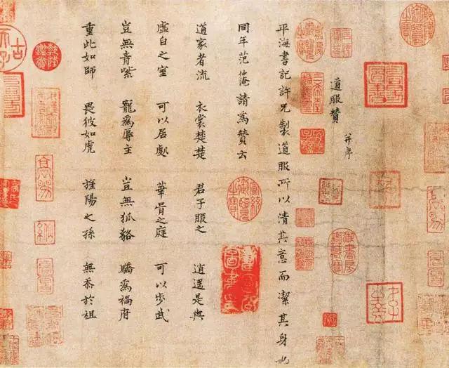 平海书记许兄制道服,所以清其意而洁其身也。同年范仲淹请为赞云: 道家者流,衣裳楚楚。君子服之,逍遥是与。 虚白之室,可以居处。华胥之庭,可以步武。 岂无青紫,宠为辱主。岂无狐貉,骄为祸府。 重此如师,畏彼如虎。旌阳之孙,无忝于祖。 ![]() 【注】 1.楷书《道服赞》,约书于北宋天禧年间,范仲淹任秘书省校书郎,时年32岁。 2.后纸有文同、吴立礼、戴蒙、柳贯、胡助、刘魁、戴仁、司马垔、吴宽等多家题跋。钤鉴藏印:“高阳图书”、“寿国公图书印”、“东汉太尉祭酒家学”、“十六世孙主奉右胜谨藏图书”、“怀州军康记”等多方,另钤清梁清标、安岐诸印,又清乾隆、嘉庆、宣统内府诸印。 3.曾经宋范氏义庄,清安岐、清内府等收藏。《铁网珊瑚》、《清河书画舫》、《清河见闻表》、《式古堂书画汇考》、《平生壮观》、《大观录》、《墨缘汇观》、《石渠宝笈初编》等书著录。刻入明文徵明《停云馆帖》、乾隆朝《三希堂法帖》等法帖。 4.张伯驹(1898—1982)以110两黄金,从北京琉璃厂古玩商蕲伯生手中购得。1956年捐献,现藏北京故宫博物院。 |